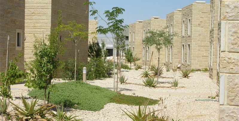 Landscaping: Pebbles from local valley cover most of the area around the buildings to help contain the dust. Deciduous trees provide shade in summer but allow the sun's rays through in winter. The public gardens’ topography is designed to contain run-off water for supplementary irrigation. By building the project with stone from Mitzpeh Ramon quarries (approx. 30 km from Sede Boker), the project receives an additional element of locality, the houses are merged into the scenery. The dust accumulating on the facades of the buildings, reinforces the “Sede Bokerian Patina”. Complimentary planning strategies ensure physical comfort and energy saving in summer and winter.